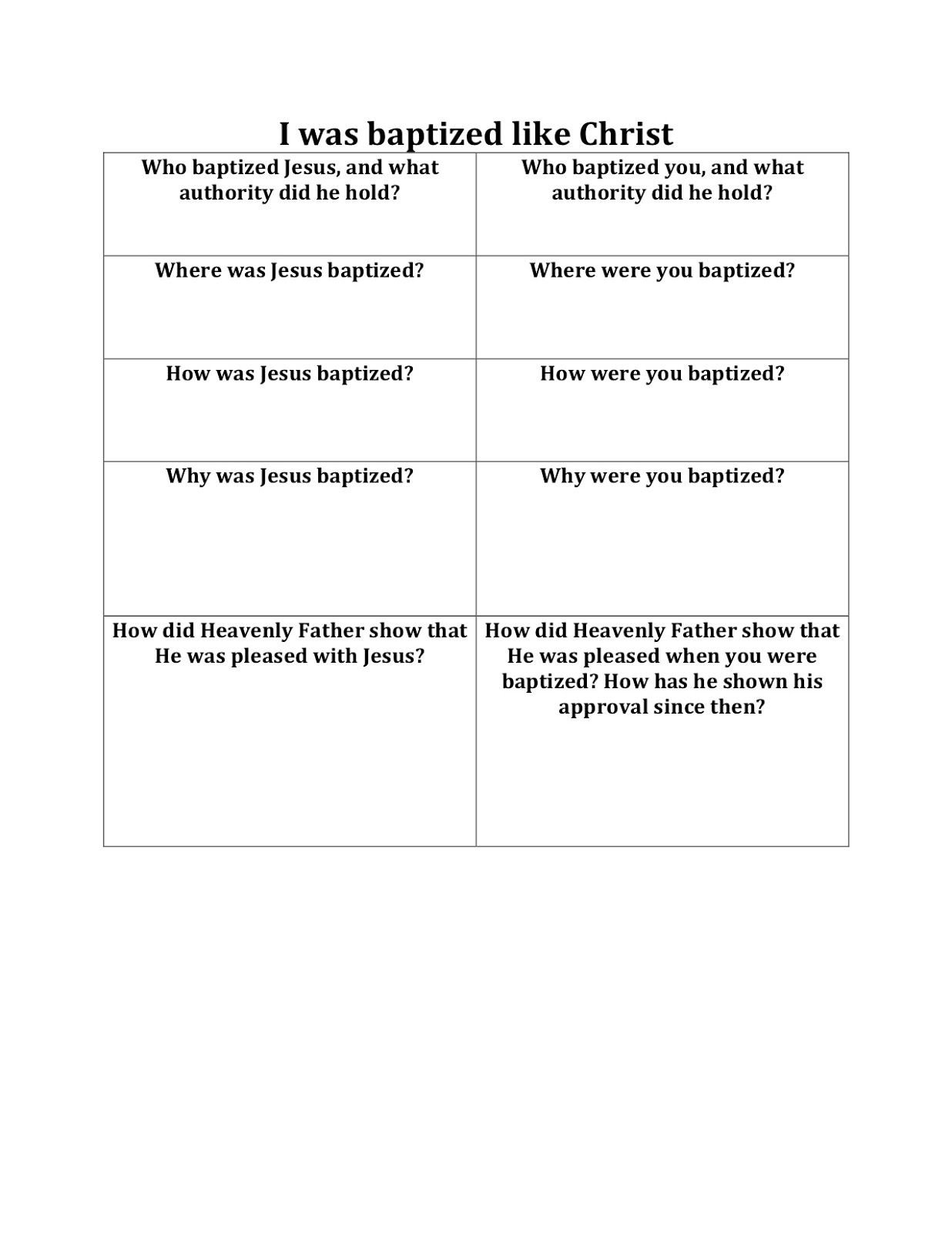Give each member of your family a copy of the table below from the "Come Follow Me" manual. Have each family member it out. Then, talk about the similarities between Jesus's baptism and their own.